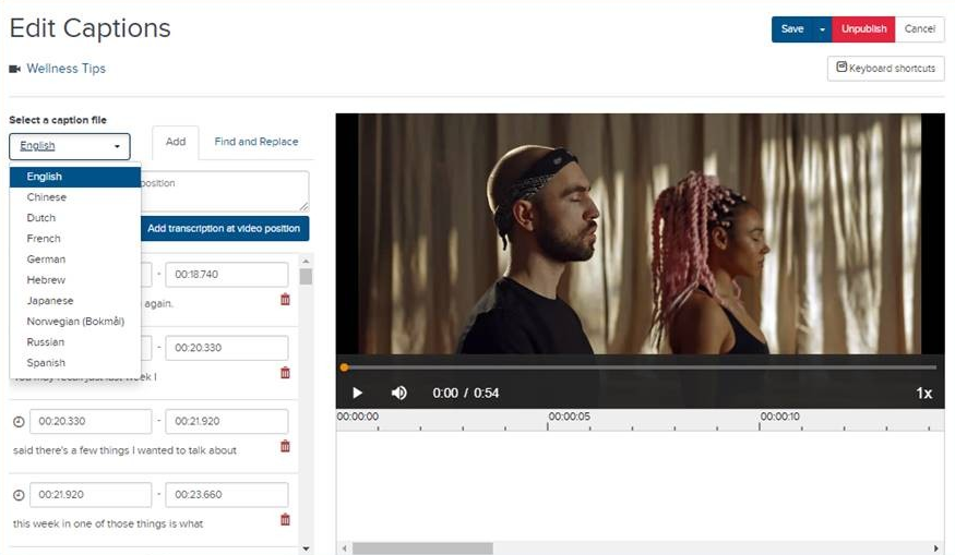 - To make the captions visible to your audience, click Publish. You can click Unpublish at any time to hide captions and make updates.