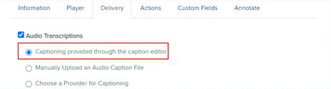 Note When you add captions using Caption Editor, the Delivery settings are updated: the Audio Transcriptions check box is selected and the Captioning provided through the caption editor option is visible and selected.