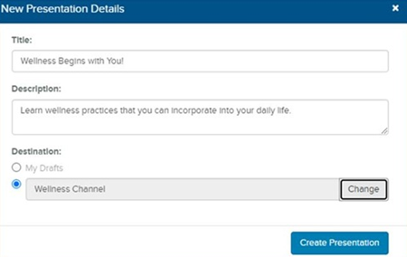 - Click Create Presentation. You can then record the presentation or upload media to it later and make it visible to other users.
