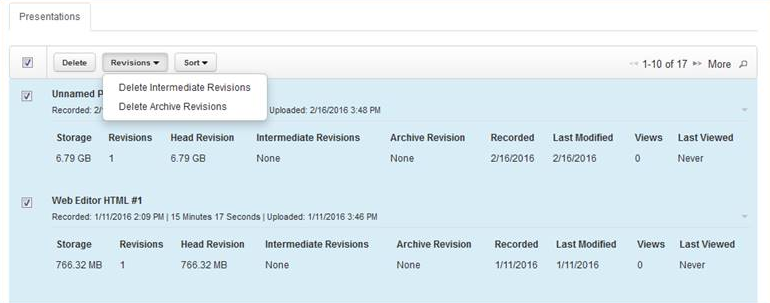 - Select the check box next to each presentation with intermediate revisions you want to remove.