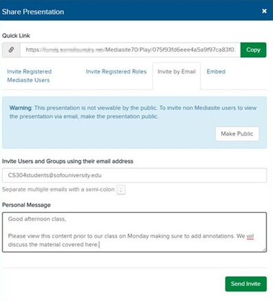You can share your presentation with users and groups by sending an email invitation that includes the presentation’s link and details. When users click the link, the presentation launches in Mediasite Player. If the presentation is not public, users must log in before they can view it.