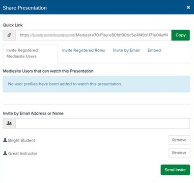- Click Invite Registered Mediasite Users in the Share Presentation dialog.