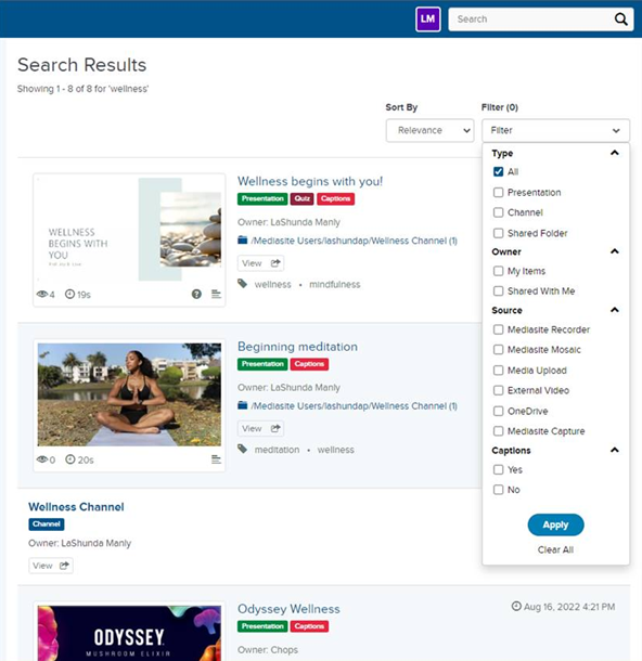 You can quickly search through My Mediasite to locate presentations, shared folders, and user channels. Mediasite uses metadata, including title, presenters, tags, and categories, to help you find a specific result or browse a range of content.