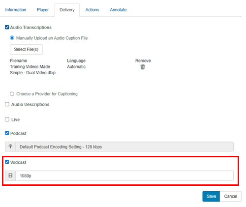 - Click Save. Mediasite generates the video podcast shortly after the presentation processes (after you record or upload media to it). The amount of time it takes depends on how busy your Mediasite is.