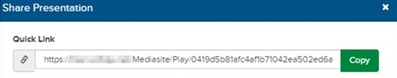 On the presentation’s properties page, you can copy the presentation’s link and share it with others via email, instant message, or through social media. When users click the link, the presentation launches in Mediasite Player. If the presentation is not public, users must log in before they can view it.