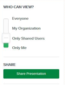 You use the Who can View? settings to give users view access to your presentations. These settings allow you to share your presentation quickly and readily determine who has view access to it.