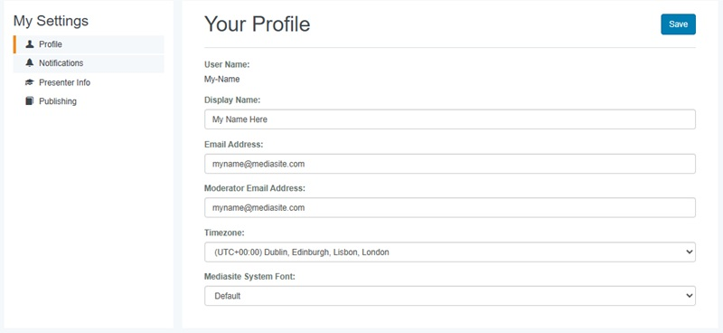 Note In some systems, your Mediasite administrator may have created your user profile. However, you can still update these settings. |