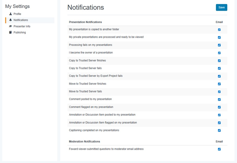 My Settings includes information such as the email address to which notifications should be sent as well as details that you want included when you are featured as a presenter in a presentation. You also use this page to enable and disable forwarding of viewer submitted questions and presentation notifications. On some systems, you have the option of syncing MyMediasite with OneDrive.