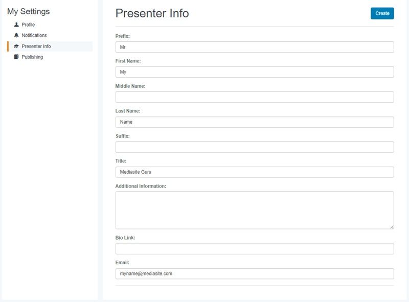 When you log in to My Mediasite for the first time, you may be asked to create a user profile. After your profile is created, you can access your profile settings at any time to update your personal information and customize your experience when using Mediasite.