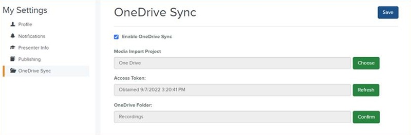 On some systems, you can sync Mediasite with your OneDrive folder to import recordings. After your recordings are in Mediasite, you can manage them the same way you manage your other presentations.