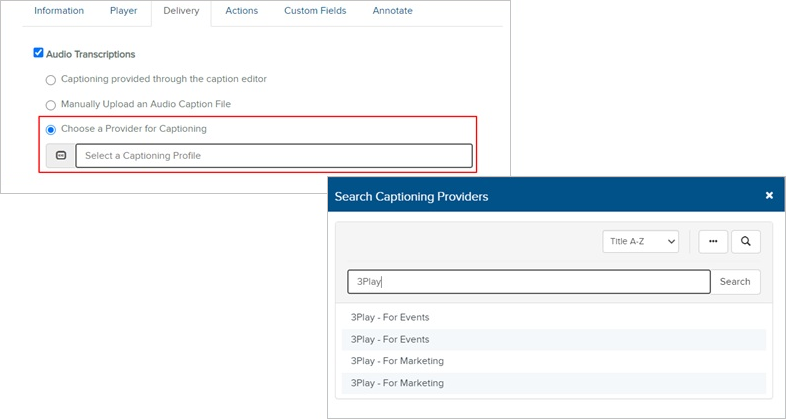 - Click in the Select a Captioning Profile field. When the Search Captioning Providers dialog appears, search for and select your captioning service provider.