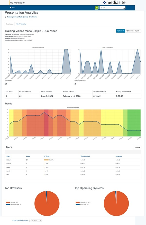 For each presentation, you can view detailed analytics that display viewing statistics such as performance data, viewing trends, and top users.