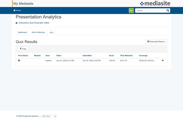 For presentations with quizzes, you can view reports containing scores for all students who have completed quizzes. You can also filter report data and download it to XML and Excel files.