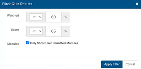 - Enter a value (0-100) into the % field for either Watched or Score. You can use the two filters together to narrow your search. For example, you would enter 60 in the Watched field and 100 in the Score field to see all students who viewed 60% or more of the presentation and scored 100% on all quizzes. Select one of the following operators from the drop-down menu(s).