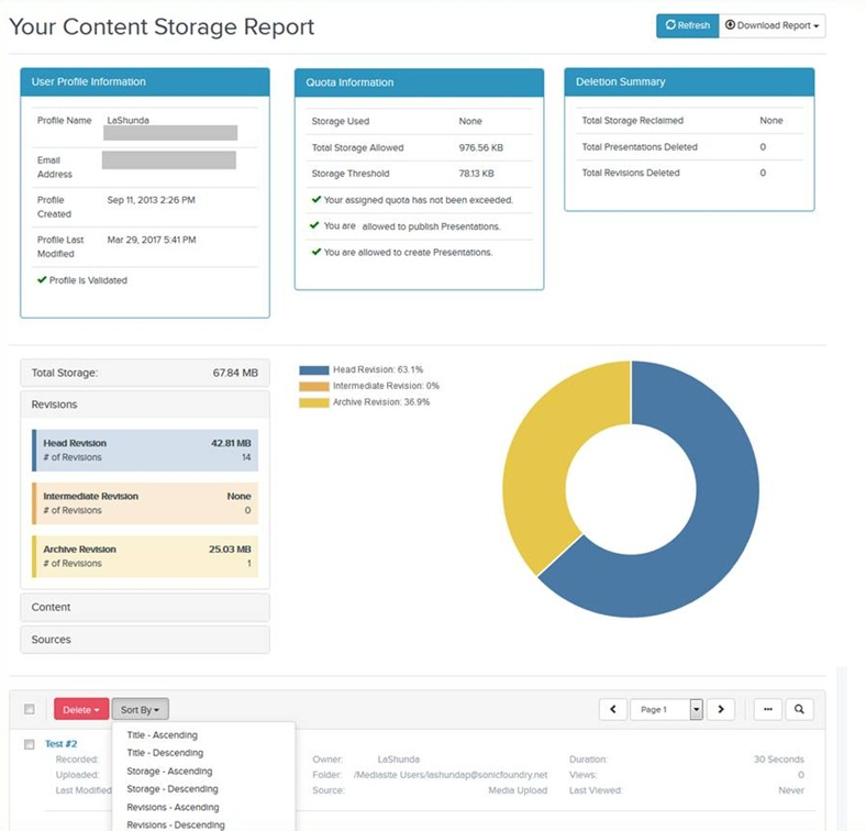 When viewing presentation details in your content storage report, you can sort the data as needed to locate items you are seeking quickly. For each presentation, the following information is available: presentation name, revision number, and storage space used (total, head revision, intermediate revisions, and archive revisions).